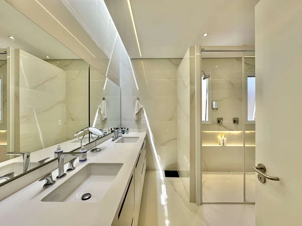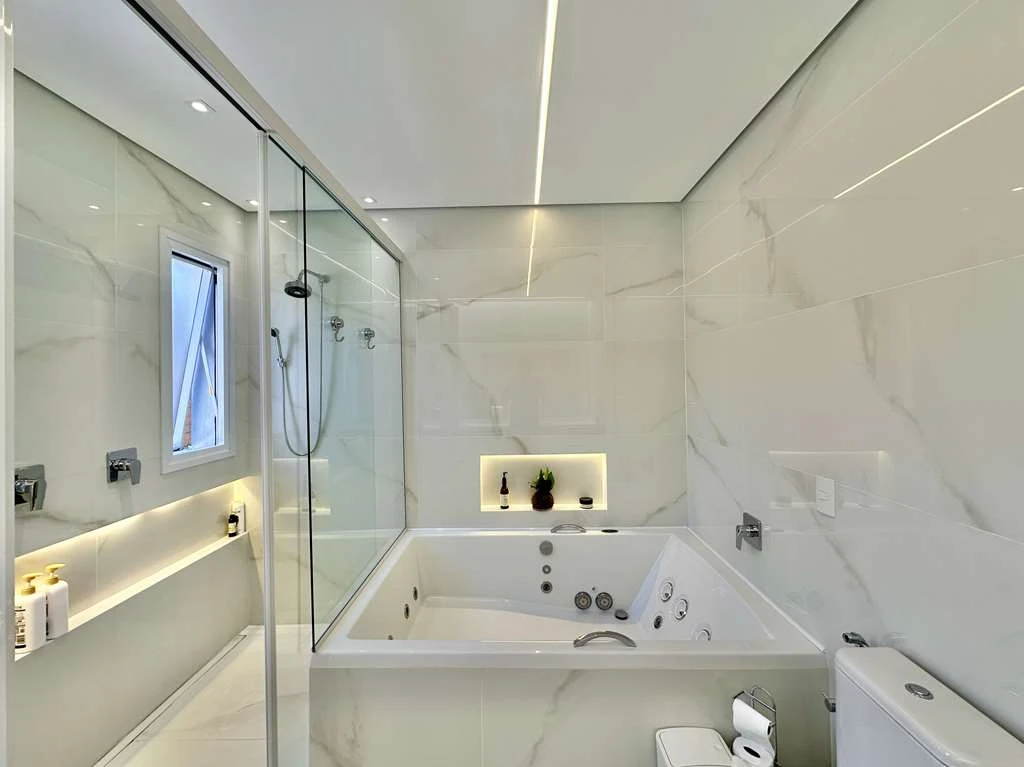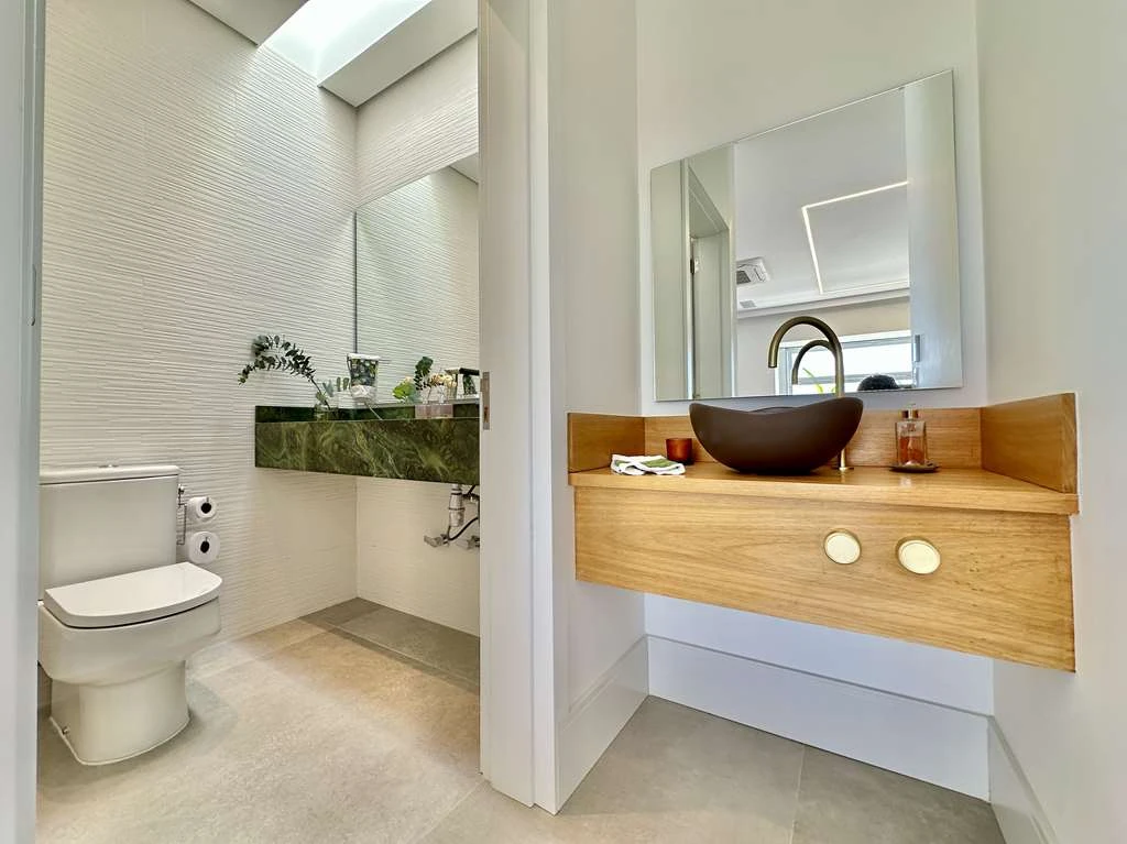 Acabamentos de alto padrão: pisos em porcelanato 1,20m x 1,20m, madeira, granito, louças Deca e Docca