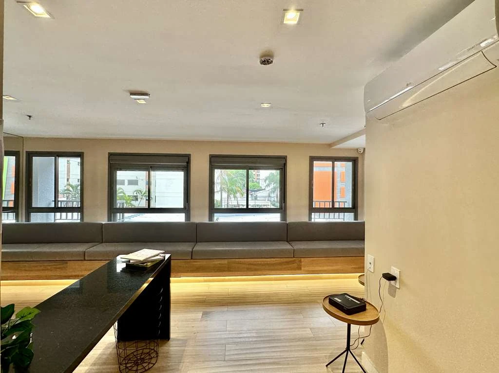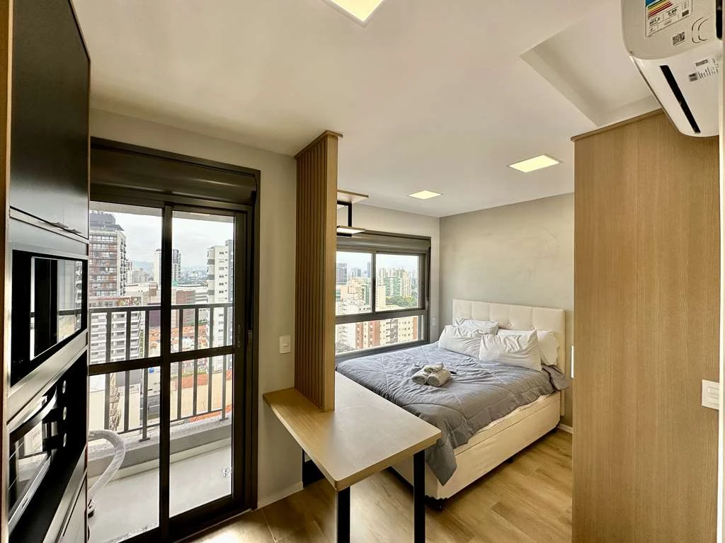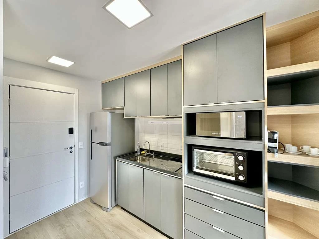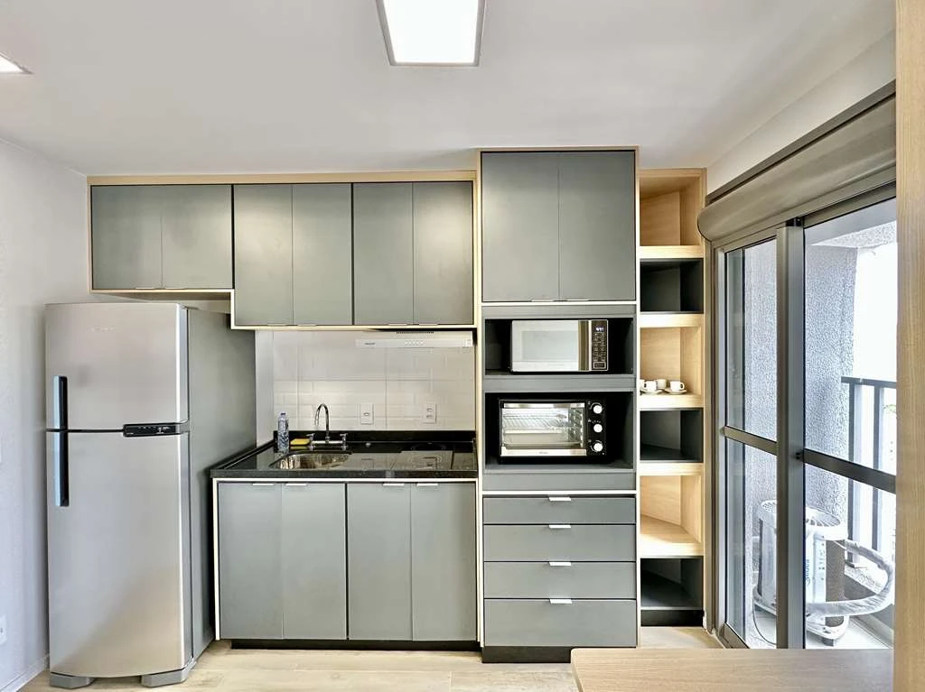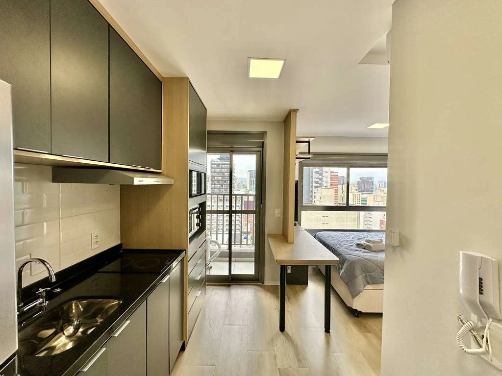 Studio moderno, mobiliado e equipado, com excelente padrão de acabamento e localização privilegiada.
