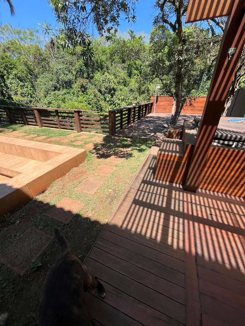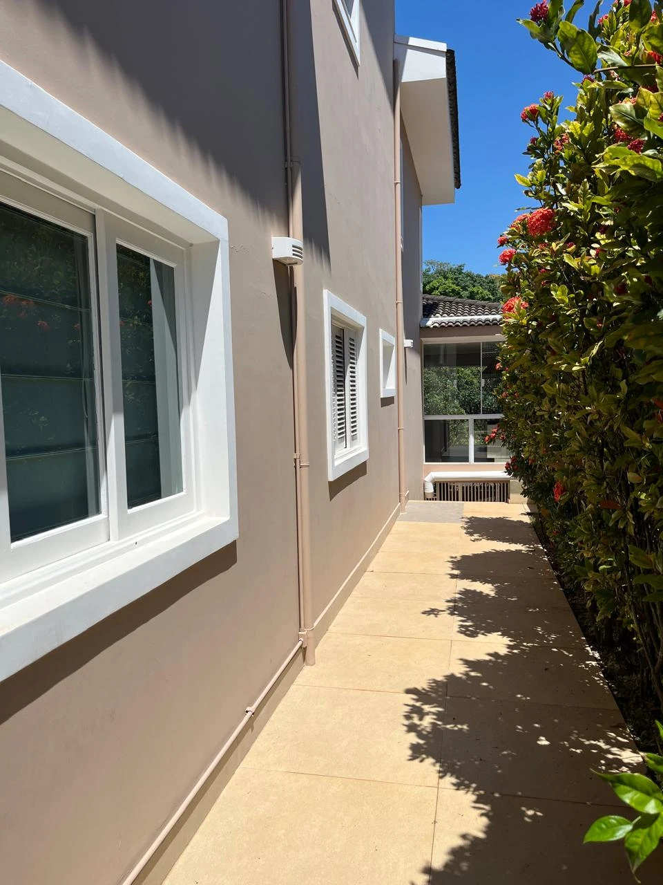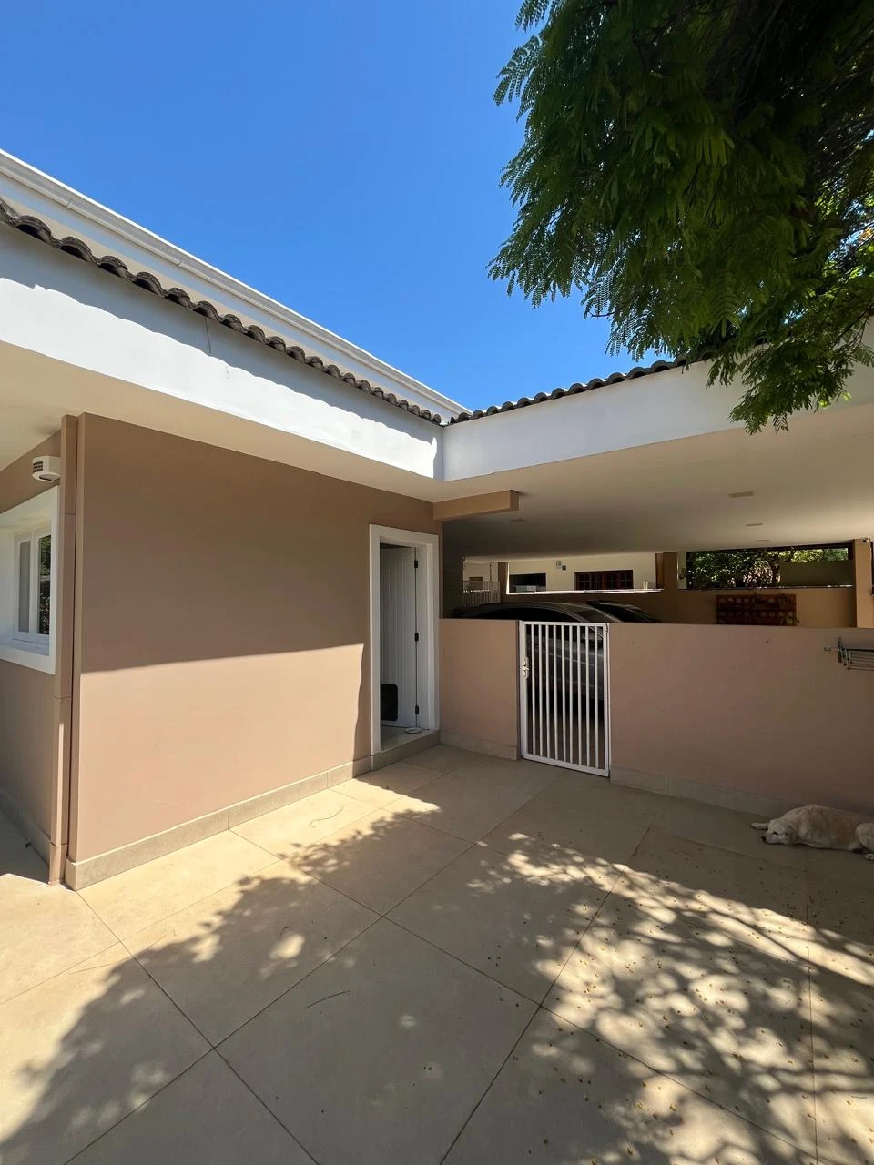 Área externa com paisagismo e garagem coberta para até 6 carros