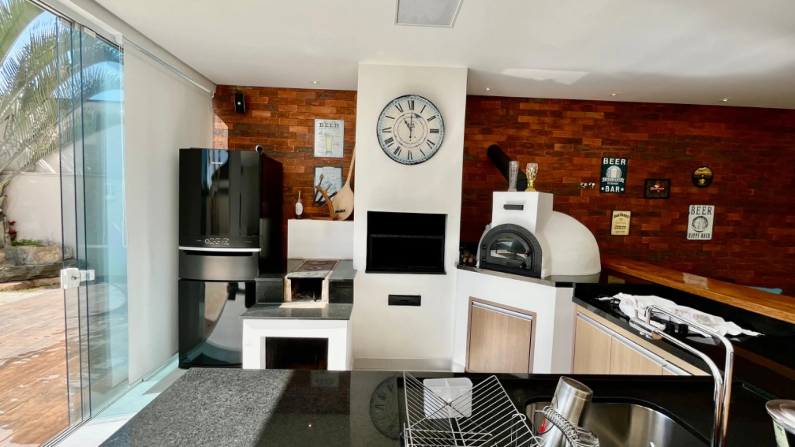 Espaço gourmet completo: fogão a lenha, forno de pizza, churrasqueira e mesa de sinuca