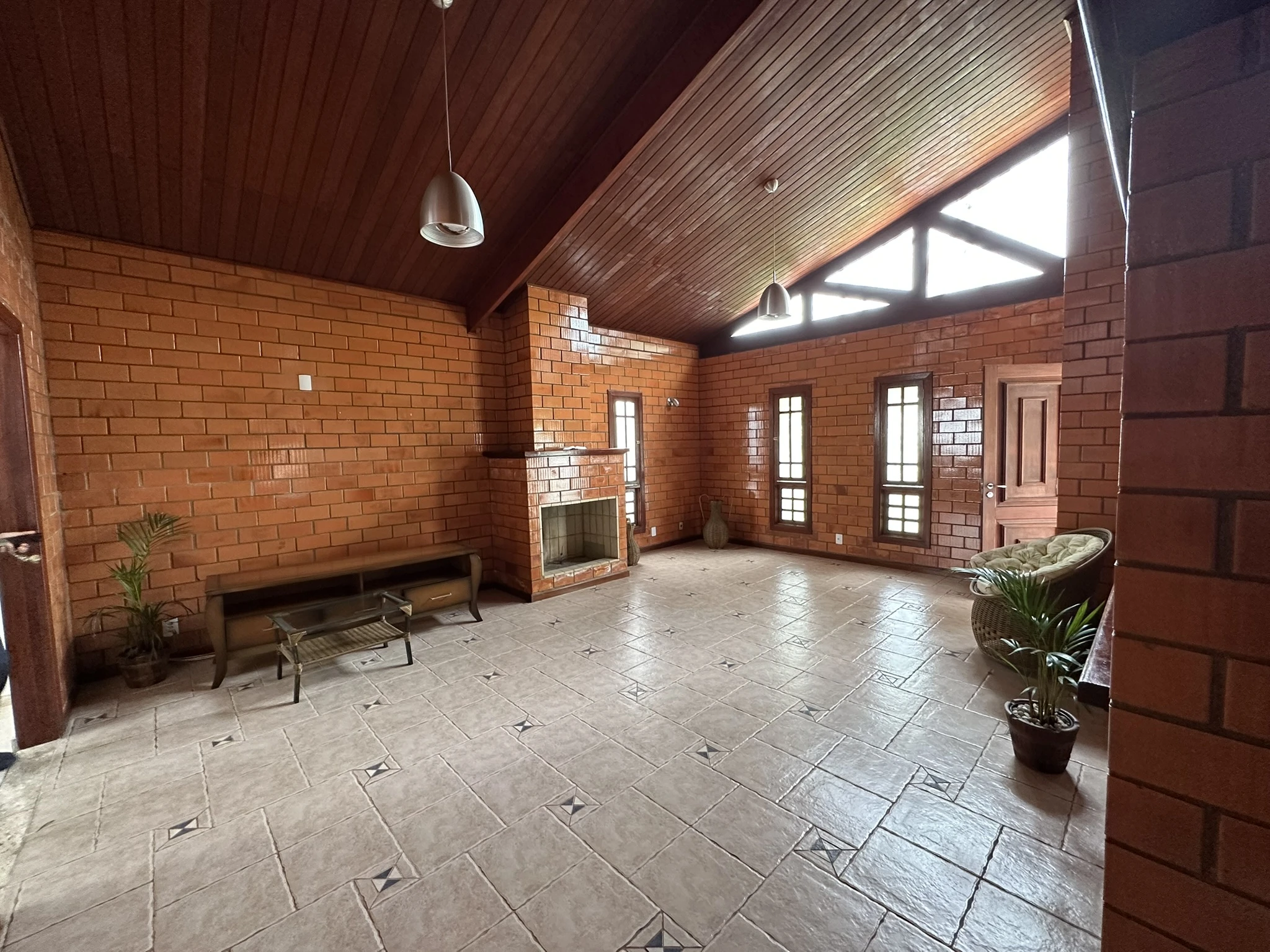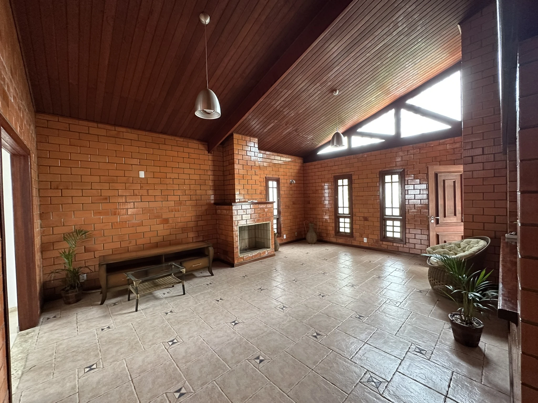 Sala ampla com pé-direito alto, lareira e dois ambientes integrados