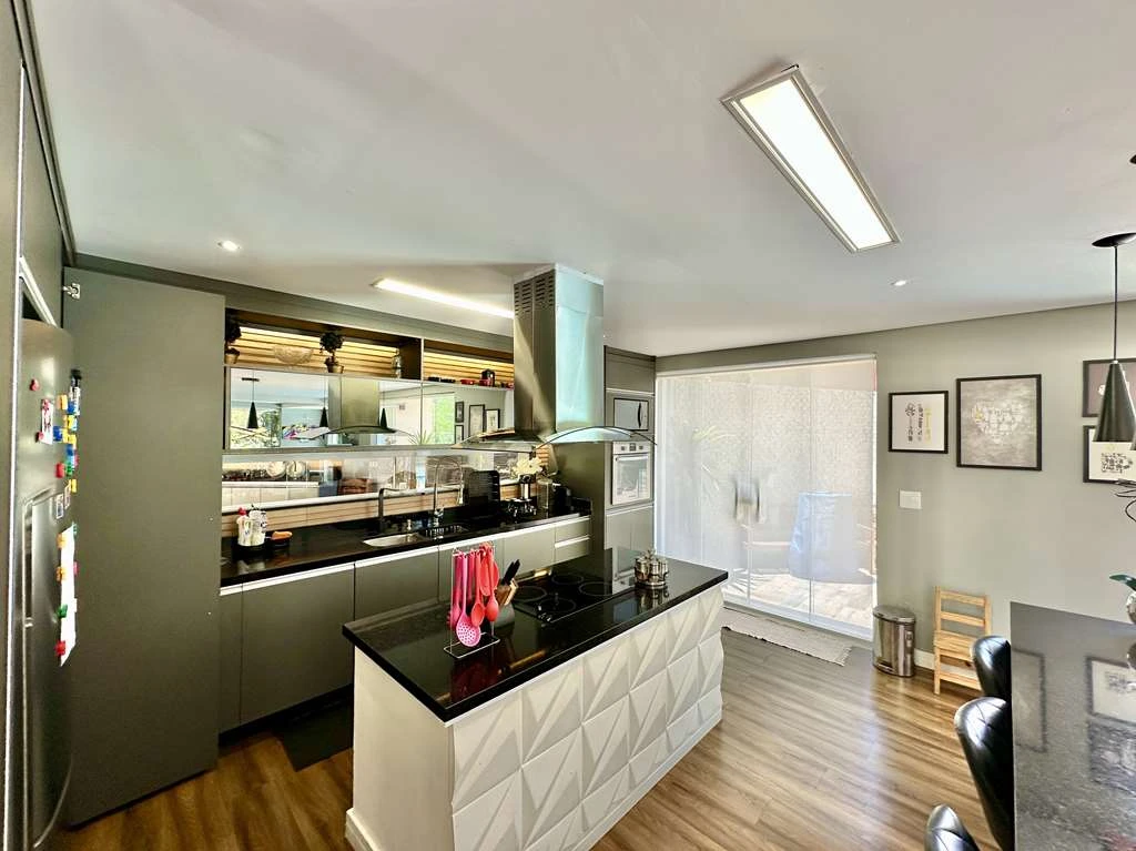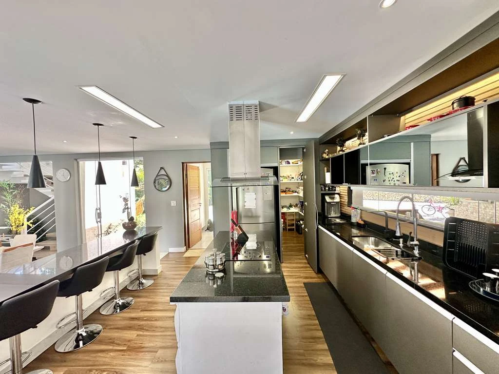 Cozinha integrada com ilha e balcão para 5 lugares.
