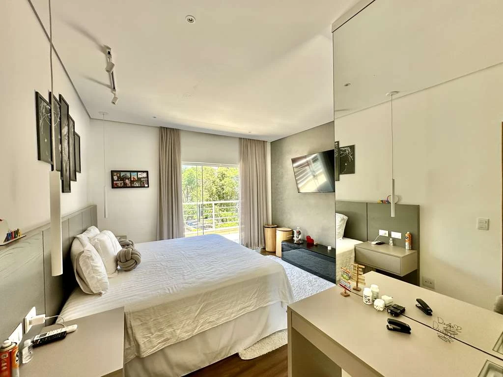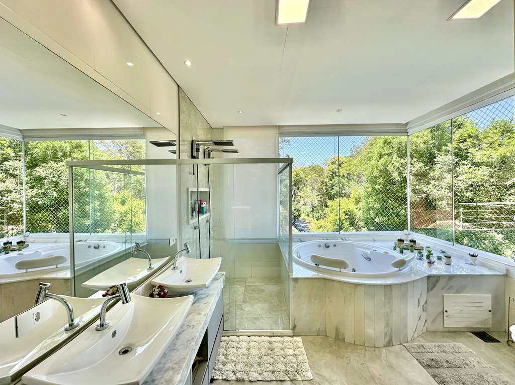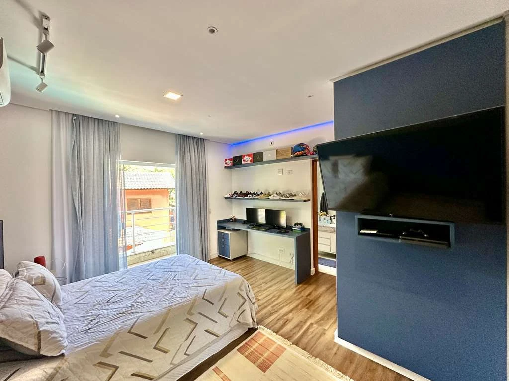Suíte master com closet Sr. e Sra., penteadeira, painel de TV e banheiro espetacular com hidro dupla, 2 duchas e 2 cubas.