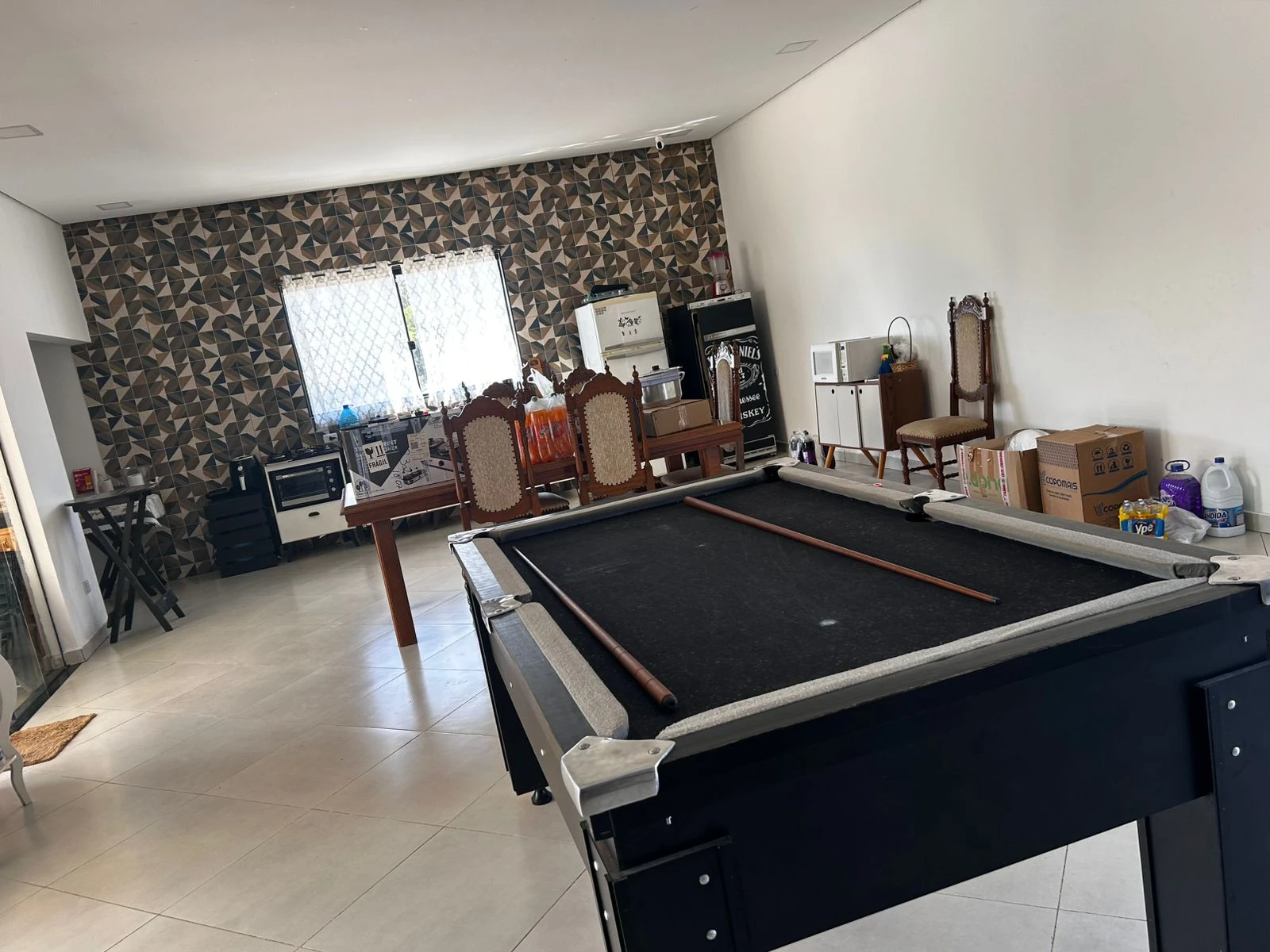 Sala de estar com sofá, rack, TV e mesa de sinuca
